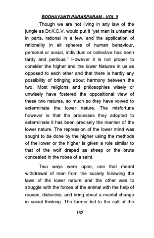 Two ways were open, one that meant withdrawal of man from the society following the laws of the lower nature and the other was to struggle with the forces of the animal with the help of reason, dialectics, and bring about a mental change in social thinking. The former led to the cult of the