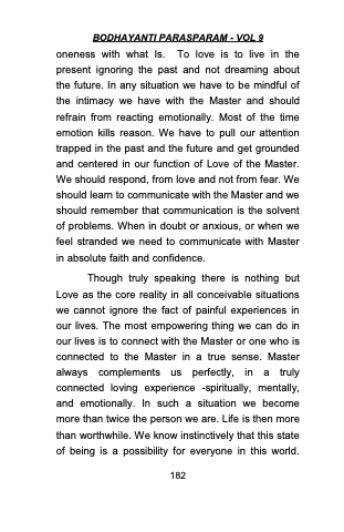 oneness with what Is. To love is to live in the present ignoring the past and not dreaming about the future. In any situation we have to be mindful of the intimacy we have with the Master and should refrain from reacting emotionally. Most of the time emotion kills reason. We have to pull our attention trapped in the past and the future and get grounded and centered in our function of Love of the Master. We should respond, from love and not from fear. We should learn to communicate with the Master and we should remember that communication is the solvent of problems. When in doubt or anxious, or when we feel stranded we need to communicate with Master in absolute faith and confidence.