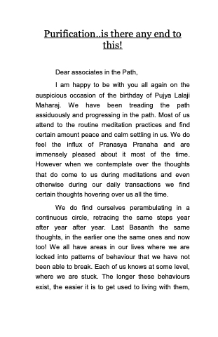 I am happy to be with you all again on the auspicious occasion of the birthday of Pujya Lalaji Maharaj. We have been treading the path assiduously and progressing in the path. Most of us attend to the routine meditation practices and find certain amount peace and calm settling in us. We do feel the influx of Pranasya Pranaha and are immensely pleased about it most of the time. However when we contemplate over the thoughts that do come to us during meditations and even otherwise during our daily transactions we find certain thoughts hovering over us all the time.