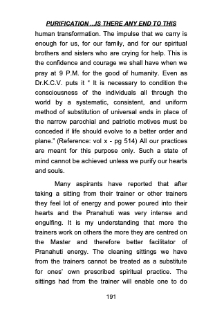 human transformation. The impulse that we carry is enough for us, for our family, and for our spiritual brothers and sisters who are crying for help. This is the confidence and courage we shall have when we pray at 9 P.M. for the good of humanity. Even as Dr.K.C.V. puts it “ It is necessary to condition the consciousness of the individuals all through the world by a systematic, consistent, and uniform method of substitution of universal ends in place of the narrow parochial and patriotic motives must be conceded if life should evolve to a better order and plane.” (Reference: vol x - pg 514) All our practices are meant for this purpose only. Such a state of mind cannot be achieved unless we purify our hearts and souls.