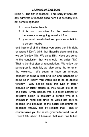 and inspite of all this things you enjoy the filth, right or wrong? Don’t think that Babuji’s statement that we don’t enjoy filth. We enjoy filth. Have you come to the conclusion that we should not enjoy filth? That is the first step of renunciation. We enjoy the pornographic material, we also enjoy the terror or the violence. We seem to have an inherent capacity of being a tiger or a lion and incapable of being so in reality, you would like to be so atleast virtually. Why people enjoy this type of terror pictures or terror stories is, they would like to be one such. Every person who is a great admirer of detective fiction is basically a person who is a criminal in mind and since he would not dare to become one because of the social constraints he becomes virtually one by reading that. This of course takes you to Freud - you better read Freud. I won’t talk about it because that man has talked