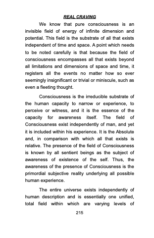 Consciousness is the irreducible substrate of the human capacity to narrow or experience, to perceive or witness, and it is the essence of the capacity for awareness itself. The field of Consciousness exist independently of man, and yet it is included within his experience. It is the Absolute and, in comparison with which all that exists is relative. The presence of the field of Consciousness is known by all sentient beings as the subject of awareness of existence of the self. Thus, the awareness of the presence of Consciousness is the primordial subjective reality underlying all possible human experience.