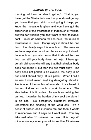 morning but I am not able to get up”. That is, you have got the Viveka to know that you should get up, you know that your sloth is not going to help, you know the message is given and you have got the experience of the awareness of that much of Viveka, but you don’t hold it, you don’t want to stick to it at all cost. I must do sadhana for one hour, that much of awareness is there. Babuji says it should be one hour. He clearly says it is one hour. The reasons we have explained at other places as why it should be one hour, you also know that it should be one hour but still your body does not help. I have got certain abhyasis who will say that their physical body does not permit it, but then the ass must obey. The body does not permit is no excuse, the body is an ass and it should obey. It is a pashu. When I call it an ass I don’t mean anything derogatory about it. Ass is one of the noblest of animals. It is a beast of burden; it does so much of work for others. The idea behind it is it carries. An ass is something that carries. It carries the burden of my soul therefore it is an ass. No derogatory statement involved, understand the meaning of the word ass. It’s a beast of burden and it carries me and then it wants to misbehave and it says no I want rest. You say take rest after 15 minutes not now. It is only 45