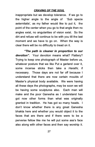 inappropriate but we develop tolerance. If we go to the higher angle to the angle of ‘Sub specie aeternitatis’, as my father would like to put it, the point of the center when you go to that angle then no angles exist, no angularities of vision exist. So the dirt and refuse will continue to be with you till the last moment and we have to go on. When the way is clear there will be no difficulty to tread on it.