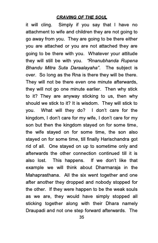 it will cling. Simply if you say that I have no attachment to wife and children they are not going to go away from you. They are going to be there either you are attached or you are not attached they are going to be there with you. Whatever your attitude they will still be with you. “Rnanubhanda Rupena Bhandu Mitra Suta Daraalayaha”. The subject is over. So long as the Rna is there they will be there. They will not be there even one minute afterwards, they will not go one minute earlier. Then why stick to it? They are anyway sticking to us, then why should we stick to it? It is wisdom. They will stick to you. What will they do? I don’t care for the kingdom, I don’t care for my wife, I don’t care for my son but then the kingdom stayed on for some time, the wife stayed on for some time, the son also stayed on for some time, till finally Harischandra got rid of all. One stayed on up to sometime only and afterwards the other connection continued till it is also lost. This happens. If we don’t like that example we will think about Dharmaraja in the Mahaprasthana. All the six went together and one after another they dropped and nobody stopped for the other. If they were happen to be the weak souls as we are, they would have simply stopped all sticking together along with their Dhara namely
