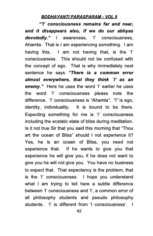 “’I’ consciousness remains far and near, and it disappears also, if we do our abhyas devotedly.” I awareness, ‘I’ consciousness, Ahamta. That is I am experiencing something. I am having this, I am not having that, is the ‘I’ consciousness. This should not be confused with the concept of ego. That is why immediately next sentence he says “There is a common error almost everywhere, that they think `I' as an enemy.” Here he uses the word ‘I’ earlier he uses the word ‘I’ consciousness please note the difference. ‘I’ consciousness is “Ahamta”. “I” is ego, identity, individuality. It is bound to be there. Expecting something for me is ‘I’ consciousness including the ecstatic state of bliss during meditation. Is it not true Sir that you said this morning that “Thou art the ocean of Bliss” should I not experience it? Yes, he is an ocean of Bliss, you need not experience that. If he wants to give you that experience he will give you, if he does not want to