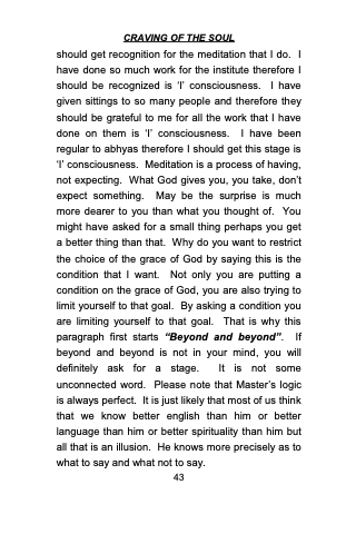 should get recognition for the meditation that I do. I have done so much work for the institute therefore I should be recognized is ‘I’ consciousness. I have given sittings to so many people and therefore they should be grateful to me for all the work that I have done on them is ‘I’ consciousness. I have been regular to abhyas therefore I should get this stage is ‘I’ consciousness. Meditation is a process of having, not expecting. What God gives you, you take, don’t expect something. May be the surprise is much more dearer to you than what you thought of. You might have asked for a small thing perhaps you get a better thing than that. Why do you want to restrict the choice of the grace of God by saying this is the condition that I want. Not only you are putting a condition on the grace of God, you are also trying to limit yourself to that goal. By asking a condition you are limiting yourself to that goal. That is why this paragraph first starts “Beyond and beyond”. If beyond and beyond is not in your mind, you will definitely ask for a stage. It is not some unconnected word. Please note that Master’s logic is always perfect. It is just likely that most of us think that we know better english than him or better language than him or better spirituality than him but all that is an illusion. He knows more precisely as to