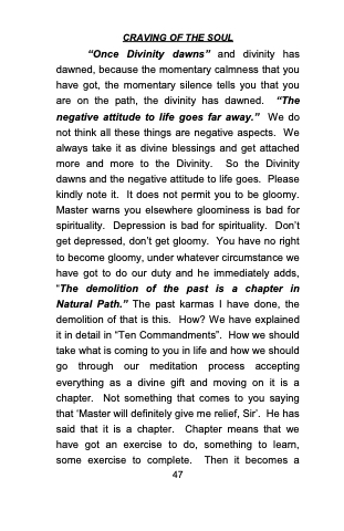 dawned, because the momentary calmness that you have got, the momentary silence tells you that you are on the path, the divinity has dawned. “The negative attitude to life goes far away.” We do not think all these things are negative aspects. We always take it as divine blessings and get attached more and more to the Divinity. So the Divinity dawns and the negative attitude to life goes. Please kindly note it. It does not permit you to be gloomy. Master warns you elsewhere gloominess is bad for spirituality. Depression is bad for spirituality. Don’t get depressed, don’t get gloomy. You have no right to become gloomy, under whatever circumstance we have got to do our duty and he immediately adds, “The demolition of the past is a chapter in Natural Path.” The past karmas I have done, the demolition of that is this. How? We have explained it in detail in “Ten Commandments”. How we should take what is coming to you in life and how we should go through our meditation process accepting everything as a divine gift and moving on it is a chapter. Not something that comes to you saying that ‘Master will definitely give me relief, Sir’. He has said that it is a chapter. Chapter means that we have got an exercise to do, something to learn,
