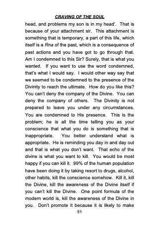 head, and problems my son is in my head’. That is because of your attachment sir. This attachment is something that is temporary, a part of this life, which itself is a Rna of the past, which is a consequence of past actions and you have got to go through that. Am I condemned to this Sir? Surely, that is what you wanted. If you want to use the word condemned, that’s what I would say. I would other way say that we seemed to be condemned to the presence of the Divinity to reach the ultimate. How do you like this? You can’t deny the company of the Divine. You can deny the company of others. The Divinity is not prepared to leave you under any circumstances. You are condemned to His presence. This is the problem; he is all the time telling you as your conscience that what you do is something that is inappropriate. You better understand what is appropriate. He is reminding you day in and day out and that is what you don’t want. That echo of the divine is what you want to kill. You would be most happy if you can kill it. 99% of the human population have been doing it by taking resort to drugs, alcohol, other habits, kill the conscience somehow. Kill it, kill the Divine, kill the awareness of the Divine itself if you can’t kill the Divine. One point formula of the modern world is, kill the awareness of the Divine in