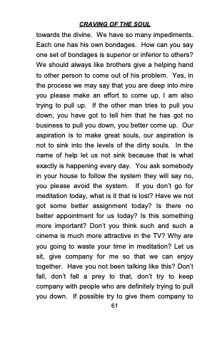 towards the divine. We have so many impediments. Each one has his own bondages. How can you say one set of bondages is superior or inferior to others? We should always like brothers give a helping hand to other person to come out of his problem. Yes, in the process we may say that you are deep into mire you please make an effort to come up, I am also trying to pull up. If the other man tries to pull you down, you have got to tell him that he has got no business to pull you down, you better come up. Our aspiration is to make great souls, our aspiration is not to sink into the levels of the dirty souls. In the name of help let us not sink because that is what exactly is happening every day. You ask somebody in your house to follow the system they will say no, you please avoid the system. If you don’t go for meditation today, what is it that is lost? Have we not got some better assignment today? Is there no better appointment for us today? Is this something more important? Don’t you think such and such a cinema is much more attractive in the TV? Why are you going to waste your time in meditation? Let us sit, give company for me so that we can enjoy together. Have you not been talking like this? Don’t fall, don’t fall a prey to that, don’t try to keep company with people who are definitely trying to pull