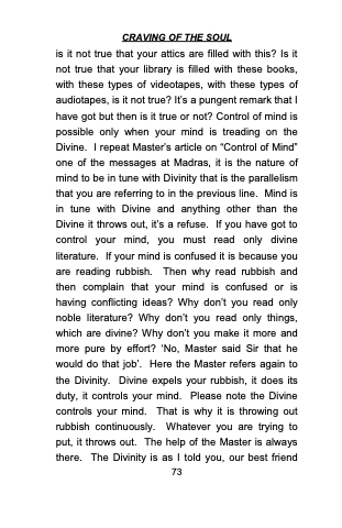 is it not true that your attics are filled with this? Is it not true that your library is filled with these books, with these types of videotapes, with these types of audiotapes, is it not true? It’s a pungent remark that I have got but then is it true or not? Control of mind is possible only when your mind is treading on the Divine. I repeat Master’s article on “Control of Mind” one of the messages at Madras, it is the nature of mind to be in tune with Divinity that is the parallelism that you are referring to in the previous line. Mind is in tune with Divine and anything other than the Divine it throws out, it’s a refuse. If you have got to control your mind, you must read only divine literature. If your mind is confused it is because you are reading rubbish. Then why read rubbish and then complain that your mind is confused or is having conflicting ideas? Why don’t you read only noble literature? Why don’t you read only things, which are divine? Why don’t you make it more and more pure by effort? ‘No, Master said Sir that he would do that job’. Here the Master refers again to the Divinity. Divine expels your rubbish, it does its duty, it controls your mind. Please note the Divine controls your mind. That is why it is throwing out rubbish continuously. Whatever you are trying to put, it throws out. The help of the Master is always
