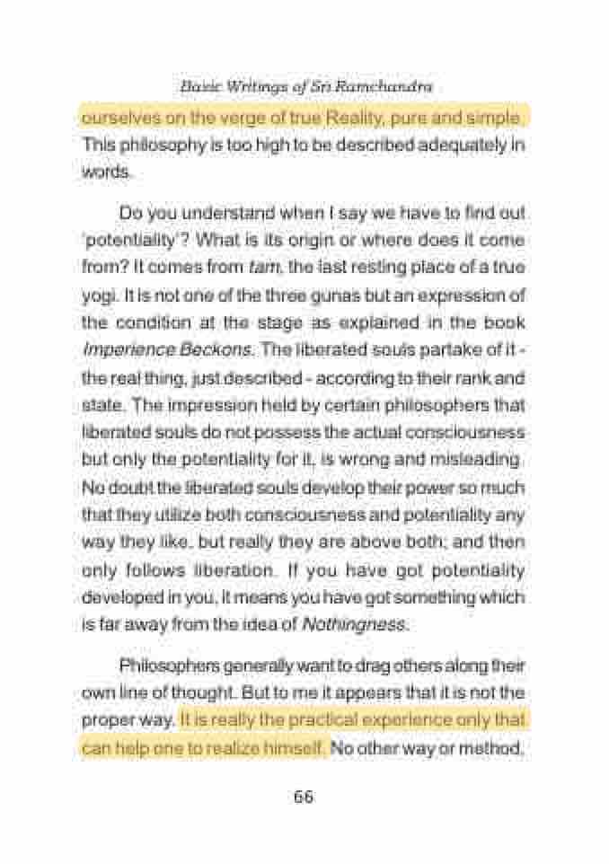 Do you understand when I say we have to find out ‘potentiality’? What is its origin or where does it come from? It comes from tam, the last resting place of a true yogi. It is not one of the three gunas but an expression of the condition at the stage as explained in the book Imperience Beckons. The liberated souls partake of it - the real thing, just described - according to their rank and state. The impression held by certain philosophers that liberated souls do not possess the actual consciousness but only the potentiality for it, is wrong and misleading. No doubt the liberated souls develop their power so much that they utilize both consciousness and potentiality any way they like, but really they are above both; and then only follows liberation. If you have got potentiality developed in you, it means you have got something which is far away from the idea of Nothingness.