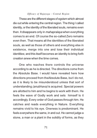 These are the different stages of egoism which almost die out while entering the central region. The thing I called identity, or the identity of the liberated souls, remains even then. It disappears only in mahapralaya when everything comes to an end. Of course the so-called Zero remains even then. That means all the identities of the liberated souls, as well as those of others and everything else in existence, merge into one and lose their individual identities; and this itself becomes an identity to bring forth creation anew when the time comes.
