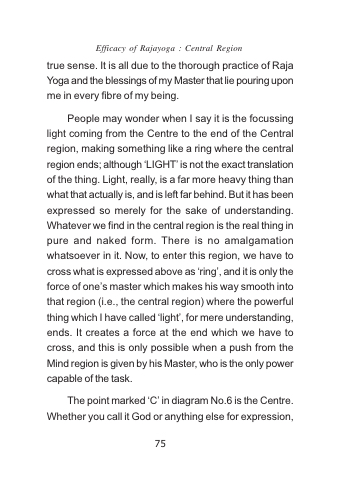 People may wonder when I say it is the focussing light coming from the Centre to the end of the Central region, making something like a ring where the central region ends; although ‘LIGHT’ is not the exact translation of the thing. Light, really, is a far more heavy thing than what that actually is, and is left far behind. But it has been expressed so merely for the sake of understanding. Whatever we find in the central region is the real thing in pure and naked form. There is no amalgamation whatsoever in it. Now, to enter this region, we have to cross what is expressed above as ‘ring’, and it is only the force of one’s master which makes his way smooth into that region (i.e., the central region) where the powerful thing which I have called ‘light’, for mere understanding, ends. It creates a force at the end which we have to cross, and this is only possible when a push from the Mind region is given by his Master, who is the only power capable of the task.