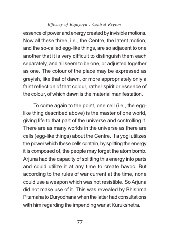 To come again to the point, one cell (i.e., the egg- like thing described above) is the master of one world, giving life to that part of the universe and controlling it. There are as many worlds in the universe as there are cells (egg-like things) about the Centre. If a yogi utilizes the power which these cells contain, by splitting the energy it is composed of, the people may forget the atom bomb. Arjuna had the capacity of splitting this energy into parts and could utilize it at any time to create havoc. But according to the rules of war current at the time, none could use a weapon which was not resistible. So Arjuna did not make use of it. This was revealed by Bhishma Pitamaha to Duryodhana when the latter had consultations with him regarding the impending war at Kurukshetra.