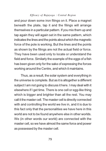 and pour down some iron filings on it. Place a magnet beneath the plate, tap it and the filings will arrange themselves in a particular pattern. If you mix them up and tap again they will again set in the same pattern, which indicates the lines and the points about which the magnetic force of the pole is working. But the lines and the points as shown by the filings are not the actual field or force. They have been used only to locate or understand the field and force. Similarly the example of the eggs of a fish has been given only for the sake of expressing the forces working around the Centre, and which it maintains.