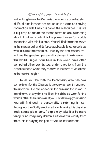 as the thing below the Centre is the essence or substratum of life, all smaller ones are wound up in a large one having connection with it which is called the master cell. It is like a big drop of ocean the foams of which are swimming about. In other words it is the power house for worlds connected with this big drop. You will find the same wave in the master cell and its force applicable to other cells as well. It is like the cream churned by the first motion. You will see the greatest personality always in existence in this world. Sages born here in this world have often controlled other worlds too, under directions from the Absolute Base which they receive in the form of vibrations in the central region.