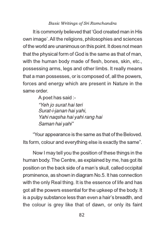Now I may tell you the position of these things in the human body. The Centre, as explained by me, has got its position on the back side of a man’s skull, called occipital prominence, as shown in diagram No.5. It has connection with the only Real thing. It is the essence of life and has got all the powers essential for the upkeep of the body. It is a pulpy substance less than even a hair’s breadth, and the colour is grey like that of dawn, or only its faint