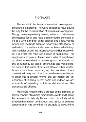 The world is in the throes of a new birth. A new pattern of culture is emerging. The ways of science have paved the way for the re-orientation of human aims and goals. Though men are presently thinking in terms of better ways of existence for all and have been forced to conceive of life as a whole and not as for oneself and a few, yet the means and methods adopted for arriving at that goal or realisation of a welfare state have not been satisfactory. Man muddles on with the rationality vouched for his growth. Yet it is a fact that man is in search of happiness. This happiness and peace of mind seem to be closely linked up. Man has to realise that he belongs to a great world not only of humanity but also of other kinds and types of life, not only on this earth of ours but also on other worlds. Science has been opening up the frontiers of our knowledge in very vast directions. We have almost begun to enter into a greater world. But our minds are yet incapable of thinking to that scale and indeed we are incapable of adjusting to this mortal world and the prospects it is offering.