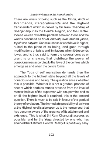 The Yoga of self realisation demands then the approach to the highest state beyond all the levels of consciousness and being. The question arises whether this is possible. Whether it is not a gradual process of ascent which enables man to proceed from the level of man to the level of the superman with a supermind and so on till the highest level is reached, this is the second question. There is much to be said in favour of the gradual theory of evolution. The immediate possibility of arriving at the Highest level is also open up to the human soul that has become aware of the urgency of its attainment and existence. This is what Sri Ram Chandraji assures as possible, and by the Yoga directed by one who has attained that Ultimate Central Reality it is positively easy.