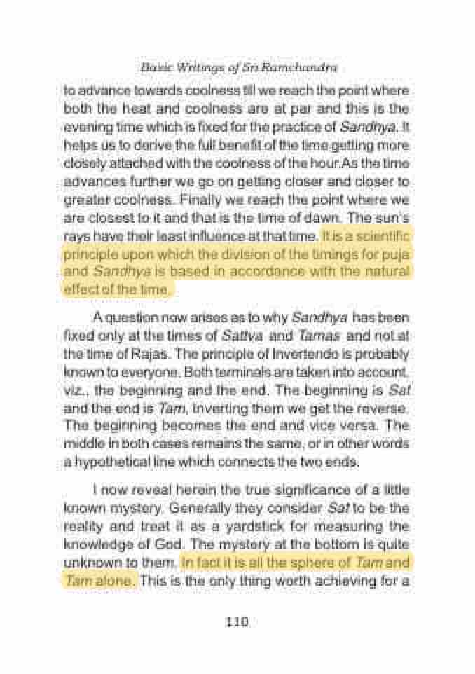 A question now arises as to why Sandhya has been fixed only at the times of Sattva and Tamas and not at the time of Rajas. The principle of Invertendo is probably known to everyone. Both terminals are taken into account, viz., the beginning and the end. The beginning is Sat and the end is Tam. Inverting them we get the reverse. The beginning becomes the end and vice versa. The middle in both cases remains the same, or in other words a hypothetical line which connects the two ends.