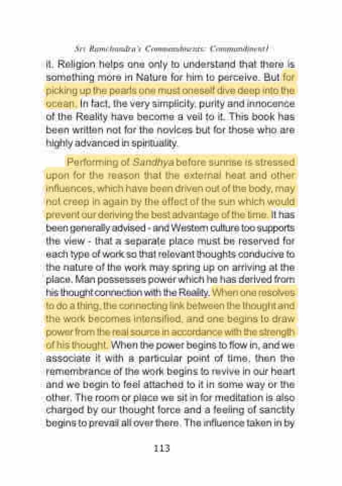 Performing of Sandhya before sunrise is stressed upon for the reason that the external heat and other influences, which have been driven out of the body, may not creep in again by the effect of the sun which would prevent our deriving the best advantage of the time. It has been generally advised - and Western culture too supports the view - that a separate place must be reserved for each type of work so that relevant thoughts conducive to the nature of the work may spring up on arriving at the place. Man possesses power which he has derived from his thought connection with the Reality. When one resolves to do a thing, the connecting link between the thought and the work becomes intensified, and one begins to draw power from the real source in accordance with the strength of his thought. When the power begins to flow in, and we associate it with a particular point of time, then the remembrance of the work begins to revive in our heart and we begin to feel attached to it in some way or the other. The room or place we sit in for meditation is also charged by our thought force and a feeling of sanctity begins to prevail all over there. The influence taken in by