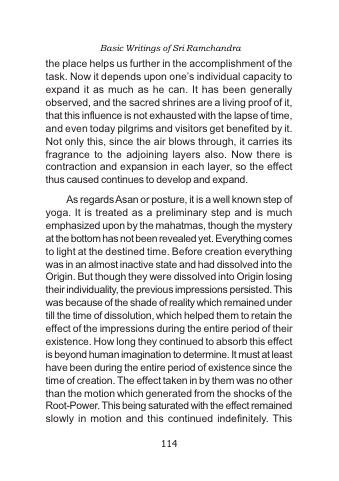 As regards Asan or posture, it is a well known step of yoga. It is treated as a preliminary step and is much emphasized upon by the mahatmas, though the mystery at the bottom has not been revealed yet. Everything comes to light at the destined time. Before creation everything was in an almost inactive state and had dissolved into the Origin. But though they were dissolved into Origin losing their individuality, the previous impressions persisted. This was because of the shade of reality which remained under till the time of dissolution, which helped them to retain the effect of the impressions during the entire period of their existence. How long they continued to absorb this effect is beyond human imagination to determine. It must at least have been during the entire period of existence since the time of creation. The effect taken in by them was no other than the motion which generated from the shocks of the Root-Power. This being saturated with the effect remained slowly in motion and this continued indefinitely. This