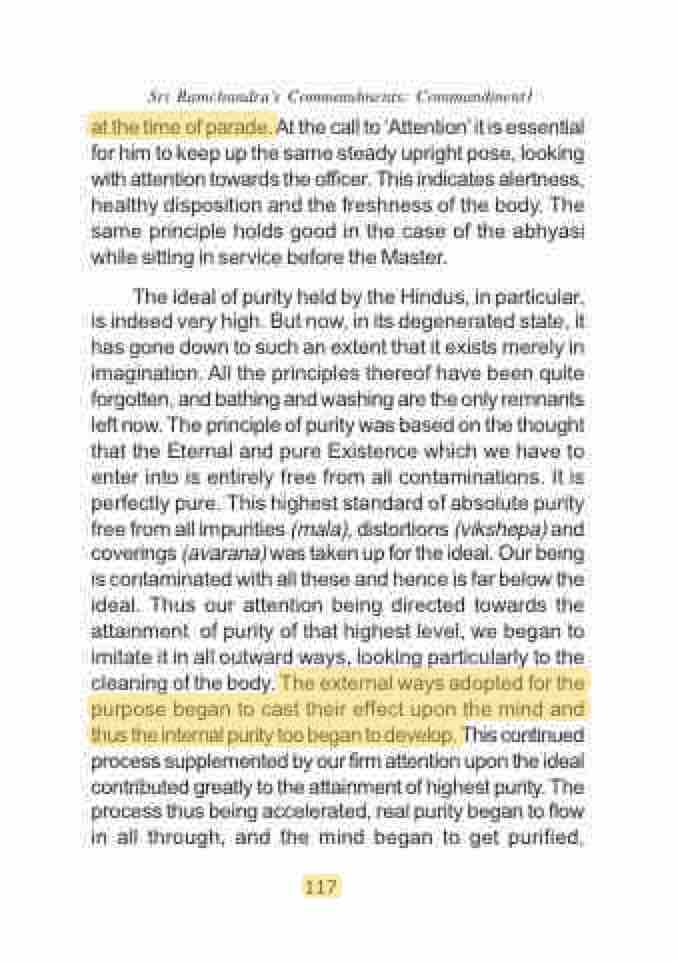 at the time of parade. At the call to ‘Attention’ it is essential for him to keep up the same steady upright pose, looking with attention towards the officer. This indicates alertness, healthy disposition and the freshness of the body. The same principle holds good in the case of the abhyasi while sitting in service before the Master.