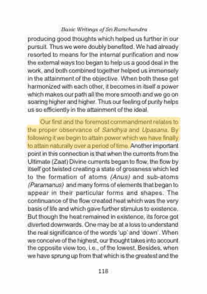 Our first and the foremost commandment relates to the proper observance of Sandhya and Upasana. By following it we begin to attain power which we have finally to attain naturally over a period of time. Another important point in this connection is that when the currents from the Ultimate (Zaat) Divine currents began to flow, the flow by itself got twisted creating a state of grossness which led to the formation of atoms (Anus) and sub-atoms (Paramanus) and many forms of elements that began to appear in their particular forms and shapes. The continuance of the flow created heat which was the very basis of life and which gave further stimulus to existence. But though the heat remained in existence, its force got diverted downwards. One may be at a loss to understand the real significance of the words ‘up’ and ‘down’. When we conceive of the highest, our thought takes into account the opposite view too, i.e., of the lowest. Besides, when we have sprung up from that which is the greatest and the