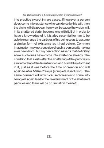 into practice except in rare cases. If however a person does come into existence who can do so by his will, then the circle will disappear from view because the vision will, in its shattered state, become one with it. But in order to have a knowledge of it, it is also essential for him to be able to rearrange the particles of his being so as to assume a similar form of existence as it had before. Common imagination may not conceive of such a personality having ever been born, but my perception asserts that definitely a few such ones have come into existence already. The condition that exists after the shattering of the particles is similar to that of the latent motion and his will lies dormant in it, just as it was before the time of creation and will again be after Maha-Pralaya (complete dissolution). The same dormant will which caused creation to come into being will again lead to the re-adjustment of the shattered particles and there will be no limitation then left.