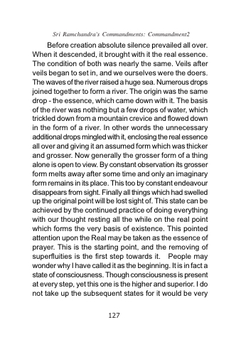 Before creation absolute silence prevailed all over. When it descended, it brought with it the real essence. The condition of both was nearly the same. Veils after veils began to set in, and we ourselves were the doers. The waves of the river raised a huge sea. Numerous drops joined together to form a river. The origin was the same drop - the essence, which came down with it. The basis of the river was nothing but a few drops of water, which trickled down from a mountain crevice and flowed down in the form of a river. In other words the unnecessary additional drops mingled with it, enclosing the real essence all over and giving it an assumed form which was thicker and grosser. Now generally the grosser form of a thing alone is open to view. By constant observation its grosser form melts away after some time and only an imaginary form remains in its place. This too by constant endeavour disappears from sight. Finally all things which had swelled up the original point will be lost sight of. This state can be achieved by the continued practice of doing everything with our thought resting all the while on the real point which forms the very basis of existence. This pointed attention upon the Real may be taken as the essence of prayer. This is the starting point, and the removing of superfluities is the first step towards it. People may wonder why I have called it as the beginning. It is in fact a state of consciousness. Though consciousness is present at every step, yet this one is the higher and superior. I do not take up the subsequent states for it would be very