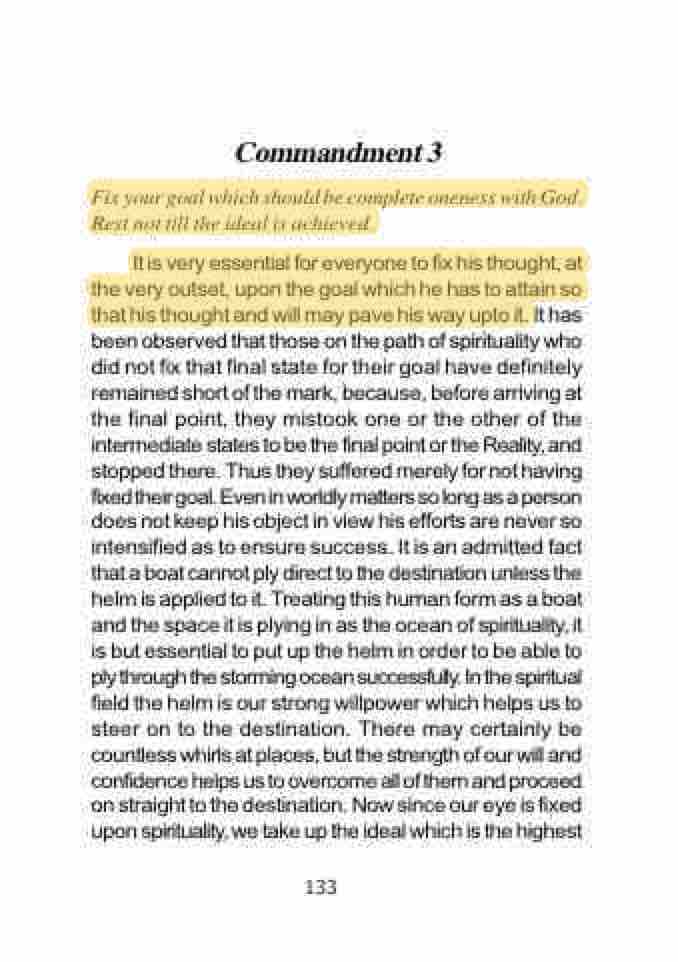 It is very essential for everyone to fix his thought, at the very outset, upon the goal which he has to attain so that his thought and will may pave his way upto it. It has been observed that those on the path of spirituality who did not fix that final state for their goal have definitely remained short of the mark, because, before arriving at the final point, they mistook one or the other of the intermediate states to be the final point or the Reality, and stopped there. Thus they suffered merely for not having fixed their goal. Even in worldly matters so long as a person does not keep his object in view his efforts are never so intensified as to ensure success. It is an admitted fact that a boat cannot ply direct to the destination unless the helm is applied to it. Treating this human form as a boat and the space it is plying in as the ocean of spirituality, it is but essential to put up the helm in order to be able to ply through the storming ocean successfully. In the spiritual field the helm is our strong willpower which helps us to steer on to the destination. There may certainly be countless whirls at places, but the strength of our will and confidence helps us to overcome all of them and proceed on straight to the destination. Now since our eye is fixed upon spirituality, we take up the ideal which is the highest