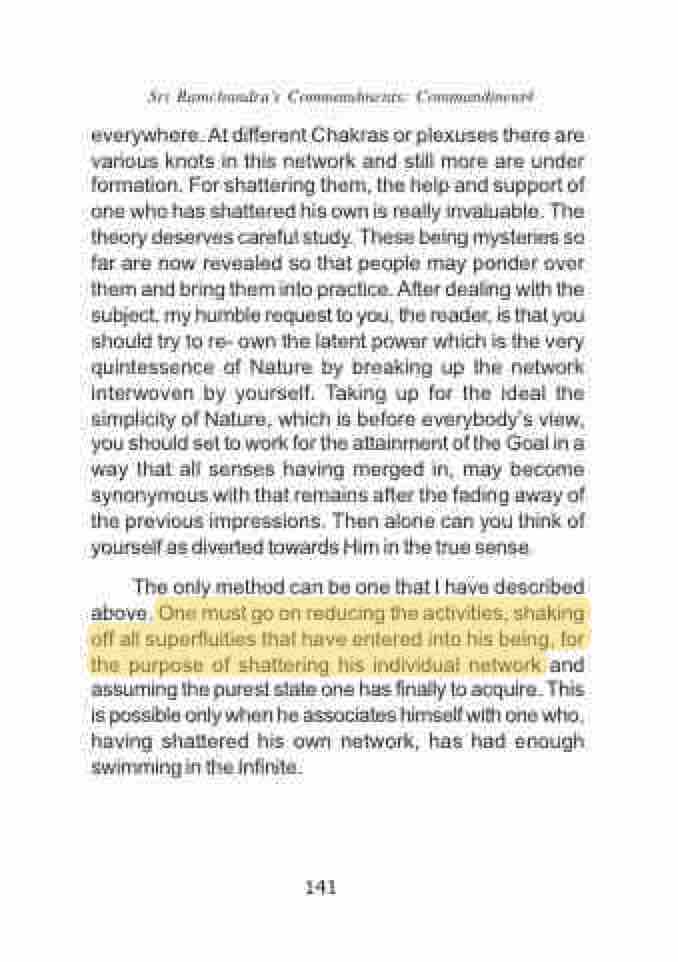 everywhere. At different Chakras or plexuses there are various knots in this network and still more are under formation. For shattering them, the help and support of one who has shattered his own is really invaluable. The theory deserves careful study. These being mysteries so far are now revealed so that people may ponder over them and bring them into practice. After dealing with the subject, my humble request to you, the reader, is that you should try to re- own the latent power which is the very quintessence of Nature by breaking up the network interwoven by yourself. Taking up for the ideal the simplicity of Nature, which is before everybody’s view, you should set to work for the attainment of the Goal in a way that all senses having merged in, may become synonymous with that remains after the fading away of the previous impressions. Then alone can you think of yourself as diverted towards Him in the true sense.