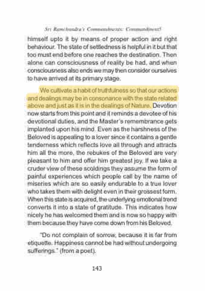 We cultivate a habit of truthfulness so that our actions and dealings may be in consonance with the state related above and just as it is in the dealings of Nature. Devotion now starts from this point and it reminds a devotee of his devotional duties, and the Master’s remembrance gets implanted upon his mind. Even as the harshness of the Beloved is appealing to a lover since it contains a gentle tenderness which reflects love all through and attracts him all the more, the rebukes of the Beloved are very pleasant to him and offer him greatest joy. If we take a cruder view of these scoldings they assume the form of painful experiences which people call by the name of miseries which are so easily endurable to a true lover who takes them with delight even in their grossest form. When this state is acquired, the underlying emotional trend converts it into a state of gratitude. This indicates how nicely he has welcomed them and is now so happy with them because they have come down from his Beloved.
