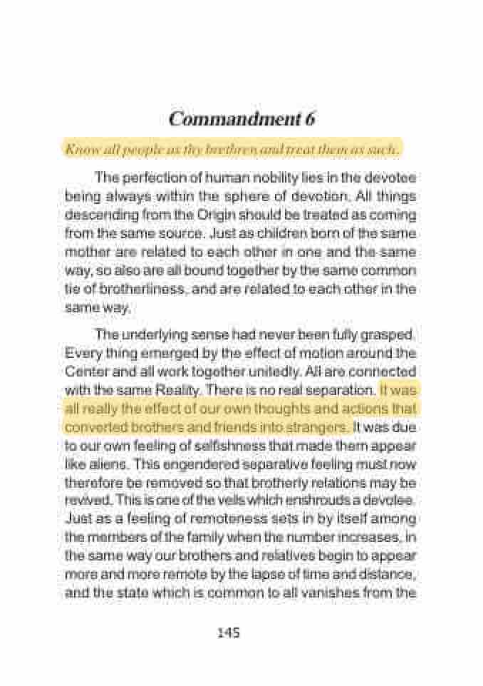 The underlying sense had never been fully grasped. Every thing emerged by the effect of motion around the Center and all work together unitedly. All are connected with the same Reality. There is no real separation. It was all really the effect of our own thoughts and actions that converted brothers and friends into strangers. It was due to our own feeling of selfishness that made them appear like aliens. This engendered separative feeling must now therefore be removed so that brotherly relations may be revived. This is one of the veils which enshrouds a devotee. Just as a feeling of remoteness sets in by itself among the members of the family when the number increases, in the same way our brothers and relatives begin to appear more and more remote by the lapse of time and distance, and the state which is common to all vanishes from the