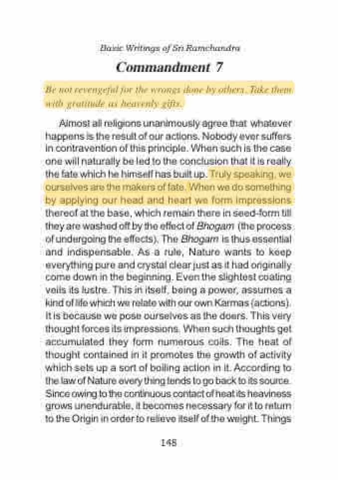 Almost all religions unanimously agree that whatever happens is the result of our actions. Nobody ever suffers in contravention of this principle. When such is the case one will naturally be led to the conclusion that it is really the fate which he himself has built up. Truly speaking, we ourselves are the makers of fate. When we do something by applying our head and heart we form impressions thereof at the base, which remain there in seed-form till they are washed off by the effect of Bhogam (the process of undergoing the effects). The Bhogam is thus essential and indispensable. As a rule, Nature wants to keep everything pure and crystal clear just as it had originally come down in the beginning. Even the slightest coating veils its lustre. This in itself, being a power, assumes a kind of life which we relate with our own Karmas (actions). It is because we pose ourselves as the doers. This very thought forces its impressions. When such thoughts get accumulated they form numerous coils. The heat of thought contained in it promotes the growth of activity which sets up a sort of boiling action in it. According to the law of Nature every thing tends to go back to its source. Since owing to the continuous contact of heat its heaviness grows unendurable, it becomes necessary for it to return to the Origin in order to relieve itself of the weight. Things