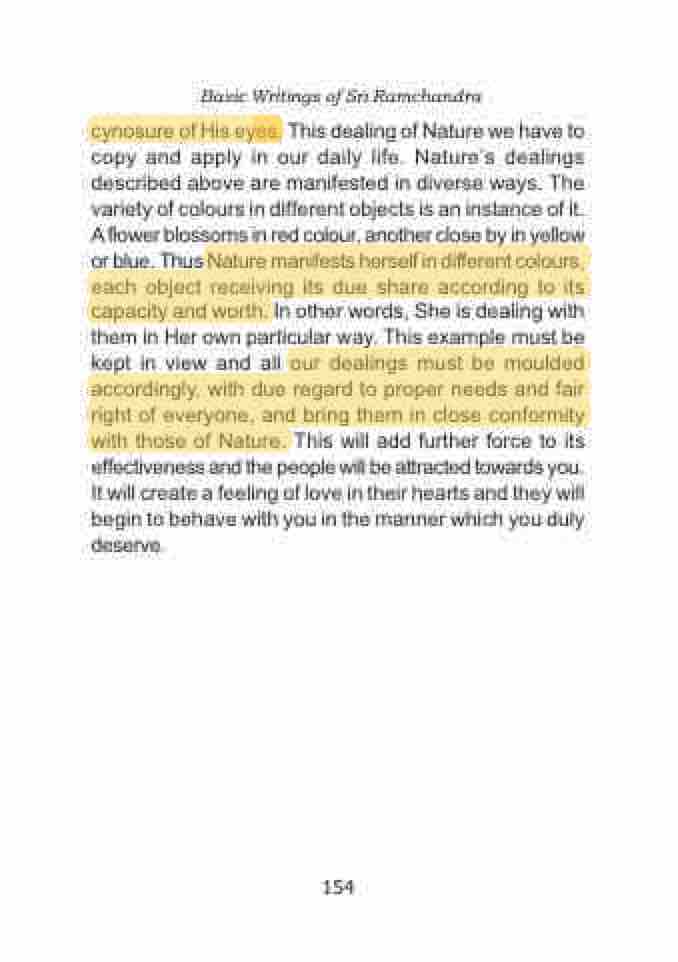 cynosure of His eyes. This dealing of Nature we have to copy and apply in our daily life. Nature’s dealings described above are manifested in diverse ways. The variety of colours in different objects is an instance of it. A flower blossoms in red colour, another close by in yellow or blue. Thus Nature manifests herself in different colours, each object receiving its due share according to its capacity and worth. In other words, She is dealing with them in Her own particular way. This example must be kept in view and all our dealings must be moulded accordingly, with due regard to proper needs and fair right of everyone, and bring them in close conformity with those of Nature. This will add further force to its effectiveness and the people will be attracted towards you. It will create a feeling of love in their hearts and they will begin to behave with you in the manner which you duly deserve.