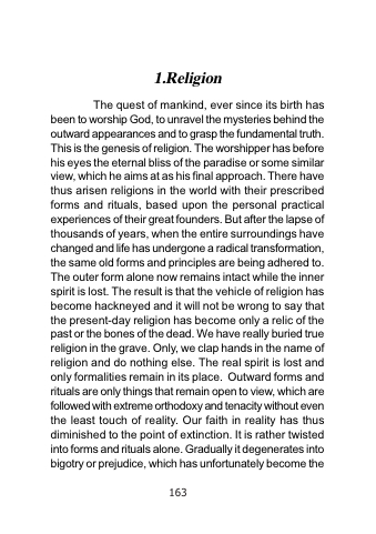 The quest of mankind, ever since its birth has been to worship God, to unravel the mysteries behind the outward appearances and to grasp the fundamental truth. This is the genesis of religion. The worshipper has before his eyes the eternal bliss of the paradise or some similar view, which he aims at as his final approach. There have thus arisen religions in the world with their prescribed forms and rituals, based upon the personal practical experiences of their great founders. But after the lapse of thousands of years, when the entire surroundings have changed and life has undergone a radical transformation, the same old forms and principles are being adhered to. The outer form alone now remains intact while the inner spirit is lost. The result is that the vehicle of religion has become hackneyed and it will not be wrong to say that the present-day religion has become only a relic of the past or the bones of the dead. We have really buried true religion in the grave. Only, we clap hands in the name of religion and do nothing else. The real spirit is lost and only formalities remain in its place. Outward forms and rituals are only things that remain open to view, which are followed with extreme orthodoxy and tenacity without even the least touch of reality. Our faith in reality has thus diminished to the point of extinction. It is rather twisted into forms and rituals alone. Gradually it degenerates into bigotry or prejudice, which has unfortunately become the
