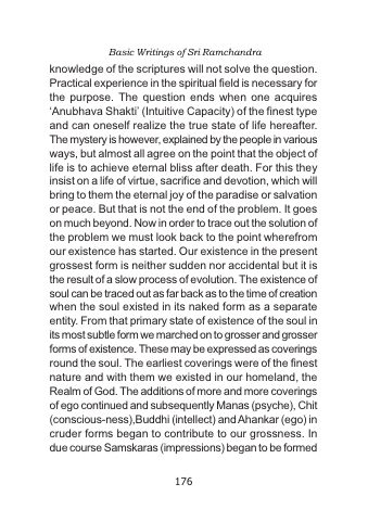 knowledge of the scriptures will not solve the question. Practical experience in the spiritual field is necessary for the purpose. The question ends when one acquires ‘Anubhava Shakti’ (Intuitive Capacity) of the finest type and can oneself realize the true state of life hereafter. The mystery is however, explained by the people in various ways, but almost all agree on the point that the object of life is to achieve eternal bliss after death. For this they insist on a life of virtue, sacrifice and devotion, which will bring to them the eternal joy of the paradise or salvation or peace. But that is not the end of the problem. It goes on much beyond. Now in order to trace out the solution of the problem we must look back to the point wherefrom our existence has started. Our existence in the present grossest form is neither sudden nor accidental but it is the result of a slow process of evolution. The existence of soul can be traced out as far back as to the time of creation when the soul existed in its naked form as a separate entity. From that primary state of existence of the soul in its most subtle form we marched on to grosser and grosser forms of existence. These may be expressed as coverings round the soul. The earliest coverings were of the finest nature and with them we existed in our homeland, the Realm of God. The additions of more and more coverings of ego continued and subsequently Manas (psyche), Chit (conscious-ness),Buddhi (intellect) and Ahankar (ego) in cruder forms began to contribute to our grossness. In due course Samskaras (impressions) began to be formed