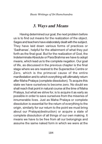 Having determined our goal, the next problem before us is to find out means for the realization of the object. Sages and teachers have elaborately dealt with the subject. They have laid down various forms of practices or ‘Sadhanas’, helpful for the attainment of what they put forth as the final goal. But for the realization of God, the Indeterminate Absolute or Para Brahma we have to adopt means, which lead us to the complete negation. Our goal of life, as discussed in the previous chapter is the final stage where we are nearest to the Superactive Centre or Zero, which is the primeval cause of the entire manifestation and to which everything will ultimately return after Maha Pralaya (complete dissolution). To acquire this state we have ourselves to become zero. No doubt we shall reach that point in natural course at the time of Maha Pralaya, but what we strive for, is to acquire it as early as possible in order to save ourselves from the miseries of innumerable lives. Just as Maha Pralaya or complete dissolution is essential for the return of everything to the origin, similarly for our return to the point we must bring about our Pralaya(destruction) or acquire a state of complete dissolution of all things of our own making. It means we have to be free from all our belongings and assume the same naked form in which we were at the