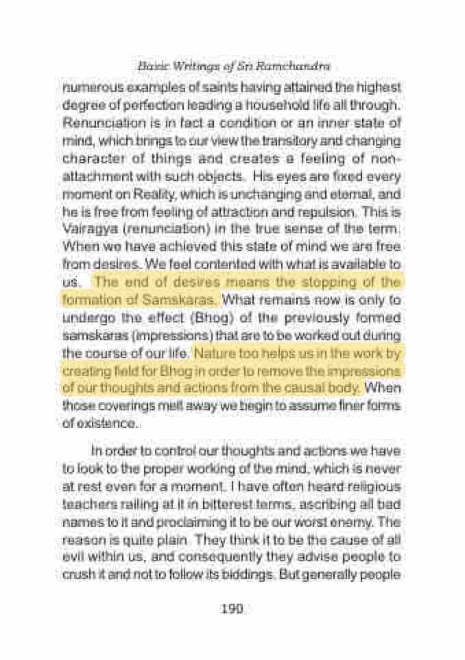 numerous examples of saints having attained the highest degree of perfection leading a household life all through. Renunciation is in fact a condition or an inner state of mind, which brings to our view the transitory and changing character of things and creates a feeling of non- attachment with such objects. His eyes are fixed every moment on Reality, which is unchanging and eternal, and he is free from feeling of attraction and repulsion. This is Vairagya (renunciation) in the true sense of the term. When we have achieved this state of mind we are free from desires. We feel contented with what is available to us. The end of desires means the stopping of the formation of Samskaras. What remains now is only to undergo the effect (Bhog) of the previously formed samskaras (impressions) that are to be worked out during the course of our life. Nature too helps us in the work by creating field for Bhog in order to remove the impressions of our thoughts and actions from the causal body. When those coverings melt away we begin to assume finer forms of existence.