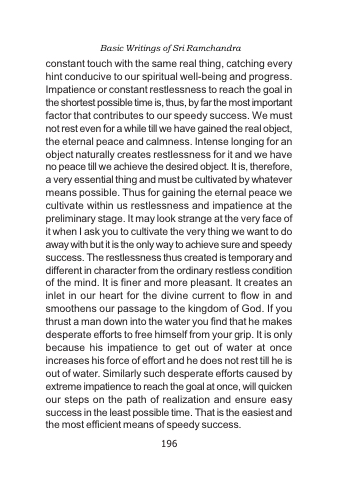 constant touch with the same real thing, catching every hint conducive to our spiritual well-being and progress. Impatience or constant restlessness to reach the goal in the shortest possible time is, thus, by far the most important factor that contributes to our speedy success. We must not rest even for a while till we have gained the real object, the eternal peace and calmness. Intense longing for an object naturally creates restlessness for it and we have no peace till we achieve the desired object. It is, therefore, a very essential thing and must be cultivated by whatever means possible. Thus for gaining the eternal peace we cultivate within us restlessness and impatience at the preliminary stage. It may look strange at the very face of it when I ask you to cultivate the very thing we want to do away with but it is the only way to achieve sure and speedy success. The restlessness thus created is temporary and different in character from the ordinary restless condition of the mind. It is finer and more pleasant. It creates an inlet in our heart for the divine current to flow in and smoothens our passage to the kingdom of God. If you thrust a man down into the water you find that he makes desperate efforts to free himself from your grip. It is only because his impatience to get out of water at once increases his force of effort and he does not rest till he is out of water. Similarly such desperate efforts caused by extreme impatience to reach the goal at once, will quicken our steps on the path of realization and ensure easy success in the least possible time. That is the easiest and the most efficient means of speedy success.