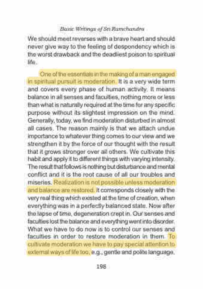 One of the essentials in the making of a man engaged in spiritual pursuit is moderation. It is a very wide term and covers every phase of human activity. It means balance in all senses and faculties, nothing more or less than what is naturally required at the time for any specific purpose without its slightest impression on the mind. Generally, today, we find moderation disturbed in almost all cases. The reason mainly is that we attach undue importance to whatever thing comes to our view and we strengthen it by the force of our thought with the result that it grows stronger over all others. We cultivate this habit and apply it to different things with varying intensity. The result that follows is nothing but disturbance and mental conflict and it is the root cause of all our troubles and miseries. Realization is not possible unless moderation and balance are restored. It corresponds closely with the very real thing which existed at the time of creation, when everything was in a perfectly balanced state. Now after the lapse of time, degeneration crept in. Our senses and faculties lost the balance and everything went into disorder. What we have to do now is to control our senses and faculties in order to restore moderation in them. To cultivate moderation we have to pay special attention to external ways of life too, e.g., gentle and polite language,