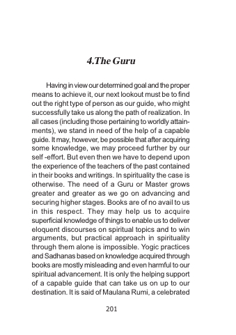 Having in view our determined goal and the proper means to achieve it, our next lookout must be to find out the right type of person as our guide, who might successfully take us along the path of realization. In all cases (including those pertaining to worldly attain- ments), we stand in need of the help of a capable guide. It may, however, be possible that after acquiring some knowledge, we may proceed further by our self -effort. But even then we have to depend upon the experience of the teachers of the past contained in their books and writings. In spirituality the case is otherwise. The need of a Guru or Master grows greater and greater as we go on advancing and securing higher stages. Books are of no avail to us in this respect. They may help us to acquire superficial knowledge of things to enable us to deliver eloquent discourses on spiritual topics and to win arguments, but practical approach in spirituality through them alone is impossible. Yogic practices and Sadhanas based on knowledge acquired through books are mostly misleading and even harmful to our spiritual advancement. It is only the helping support of a capable guide that can take us on up to our destination. It is said of Maulana Rumi, a celebrated
