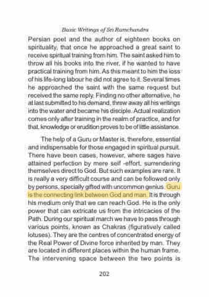 The help of a Guru or Master is, therefore, essential and indispensable for those engaged in spiritual pursuit. There have been cases, however, where sages have attained perfection by mere self -effort, surrendering themselves direct to God. But such examples are rare. It is really a very difficult course and can be followed only by persons, specially gifted with uncommon genius. Guru is the connecting link between God and man. It is through his medium only that we can reach God. He is the only power that can extricate us from the intricacies of the Path. During our spiritual march we have to pass through various points, known as Chakras (figuratively called lotuses). They are the centres of concentrated energy of the Real Power of Divine force inherited by man. They are located in different places within the human frame. The intervening space between the two points is