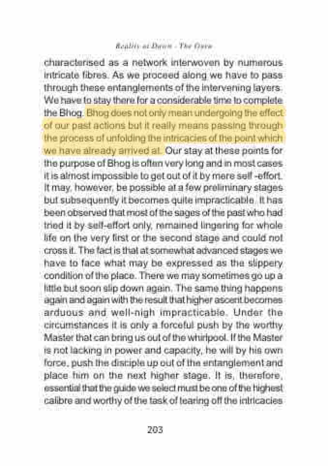characterised as a network interwoven by numerous intricate fibres. As we proceed along we have to pass through these entanglements of the intervening layers. We have to stay there for a considerable time to complete the Bhog. Bhog does not only mean undergoing the effect of our past actions but it really means passing through the process of unfolding the intricacies of the point which we have already arrived at. Our stay at these points for the purpose of Bhog is often very long and in most cases it is almost impossible to get out of it by mere self -effort. It may, however, be possible at a few preliminary stages but subsequently it becomes quite impracticable. It has been observed that most of the sages of the past who had tried it by self-effort only, remained lingering for whole life on the very first or the second stage and could not cross it. The fact is that at somewhat advanced stages we have to face what may be expressed as the slippery condition of the place. There we may sometimes go up a little but soon slip down again. The same thing happens again and again with the result that higher ascent becomes arduous and well-nigh impracticable. Under the circumstances it is only a forceful push by the worthy Master that can bring us out of the whirlpool. If the Master is not lacking in power and capacity, he will by his own force, push the disciple up out of the entanglement and place him on the next higher stage. It is, therefore, essential that the guide we select must be one of the highest calibre and worthy of the task of tearing off the intricacies