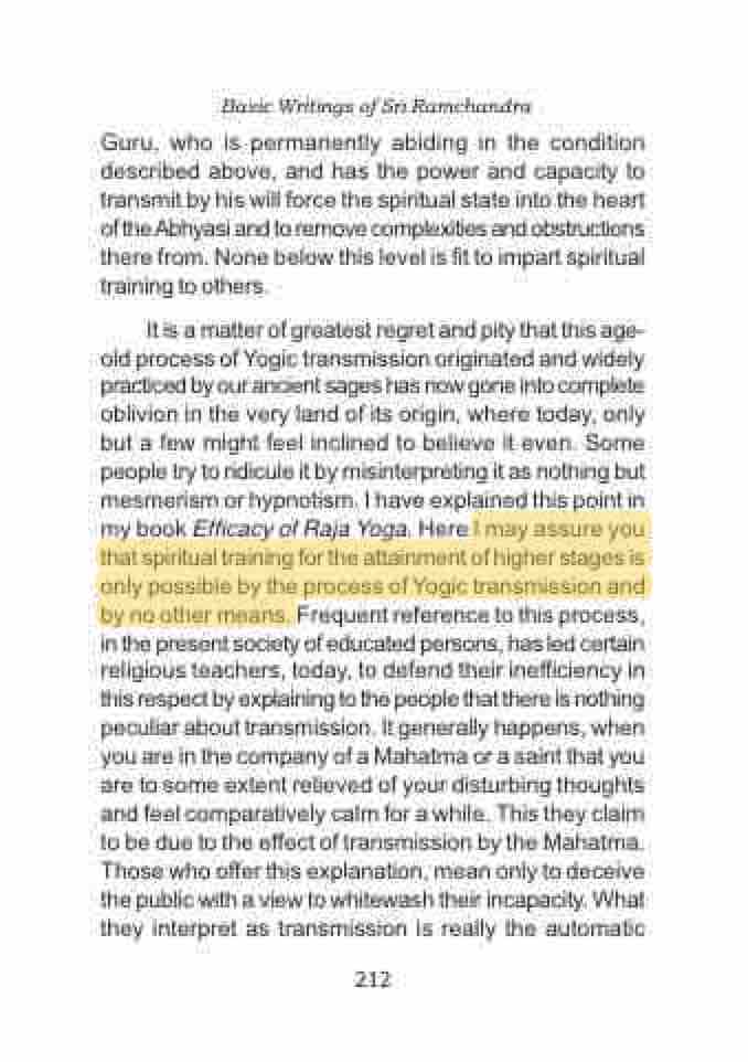 It is a matter of greatest regret and pity that this age- old process of Yogic transmission originated and widely practiced by our ancient sages has now gone into complete oblivion in the very land of its origin, where today, only but a few might feel inclined to believe it even. Some people try to ridicule it by misinterpreting it as nothing but mesmerism or hypnotism. I have explained this point in my book Efficacy of Raja Yoga. Here I may assure you that spiritual training for the attainment of higher stages is only possible by the process of Yogic transmission and by no other means. Frequent reference to this process, in the present society of educated persons, has led certain religious teachers, today, to defend their inefficiency in this respect by explaining to the people that there is nothing peculiar about transmission. It generally happens, when you are in the company of a Mahatma or a saint that you are to some extent relieved of your disturbing thoughts and feel comparatively calm for a while. This they claim to be due to the effect of transmission by the Mahatma. Those who offer this explanation, mean only to deceive the public with a view to whitewash their incapacity. What they interpret as transmission is really the automatic