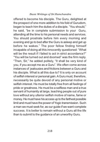 offered to become his disciple. The Guru, delighted at the prospect of one more addition to his fold of Gurudom, began to teach him the duties of a disciple. “You should,” he said, “be in complete submission to your Guru, attending all the time to his personal needs and services. You should prostrate before him every morning and evening and go to bed after the Guru is asleep and get up before he wakes.” The poor fellow finding himself incapable of doing all this innocently questioned: “What will be the result if I failed to act in strict accordance?” “You will be turned out and doomed” was the firm reply. “Then, Sir,” he added politely, “It shall be very kind of you, if you accept me as a Guru”. We often come across instances of jealousies and frictions between a Guru and his disciple. What is all this due to? It is only on account of selfish interest or personal gain. A Guru must, therefore, necessarily be quite devoid of any personal motive or selfish interest. He must be totally free from all feelings of pride or greatness. He must be a selfless man and a true servant of humanity at large, teaching people out of pure love without any ulterior selfish motive of name, fame or money. He must have his access up to the farthest possible limit and must have the power of Yogic transmission. Such a man we must seek for, as our guide if we want complete success. It is better to remain without a Guru all the life than to submit to the guidance of an unworthy Guru.