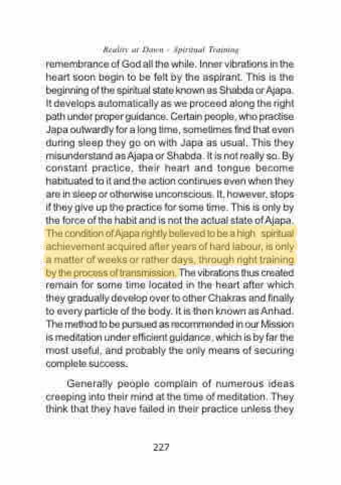 remembrance of God all the while. Inner vibrations in the heart soon begin to be felt by the aspirant. This is the beginning of the spiritual state known as Shabda or Ajapa. It develops automatically as we proceed along the right path under proper guidance. Certain people, who practise Japa outwardly for a long time, sometimes find that even during sleep they go on with Japa as usual. This they misunderstand as Ajapa or Shabda. It is not really so. By constant practice, their heart and tongue become habituated to it and the action continues even when they are in sleep or otherwise unconscious. It, however, stops if they give up the practice for some time. This is only by the force of the habit and is not the actual state of Ajapa. TheconditionofAjaparightlybelievedtobeahigh spiritual achievement acquired after years of hard labour, is only a matter of weeks or rather days, through right training by the process of transmission. The vibrations thus created remain for some time located in the heart after which they gradually develop over to other Chakras and finally to every particle of the body. It is then known as Anhad. The method to be pursued as recommended in our Mission is meditation under efficient guidance, which is by far the most useful, and probably the only means of securing complete success.