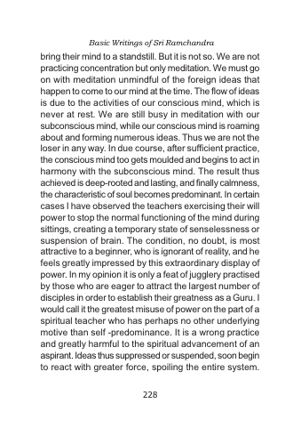 bring their mind to a standstill. But it is not so. We are not practicing concentration but only meditation. We must go on with meditation unmindful of the foreign ideas that happen to come to our mind at the time. The flow of ideas is due to the activities of our conscious mind, which is never at rest. We are still busy in meditation with our subconscious mind, while our conscious mind is roaming about and forming numerous ideas. Thus we are not the loser in any way. In due course, after sufficient practice, the conscious mind too gets moulded and begins to act in harmony with the subconscious mind. The result thus achieved is deep-rooted and lasting, and finally calmness, the characteristic of soul becomes predominant. In certain cases I have observed the teachers exercising their will power to stop the normal functioning of the mind during sittings, creating a temporary state of senselessness or suspension of brain. The condition, no doubt, is most attractive to a beginner, who is ignorant of reality, and he feels greatly impressed by this extraordinary display of power. In my opinion it is only a feat of jugglery practised by those who are eager to attract the largest number of disciples in order to establish their greatness as a Guru. I would call it the greatest misuse of power on the part of a spiritual teacher who has perhaps no other underlying motive than self -predominance. It is a wrong practice and greatly harmful to the spiritual advancement of an aspirant. Ideas thus suppressed or suspended, soon begin to react with greater force, spoiling the entire system.